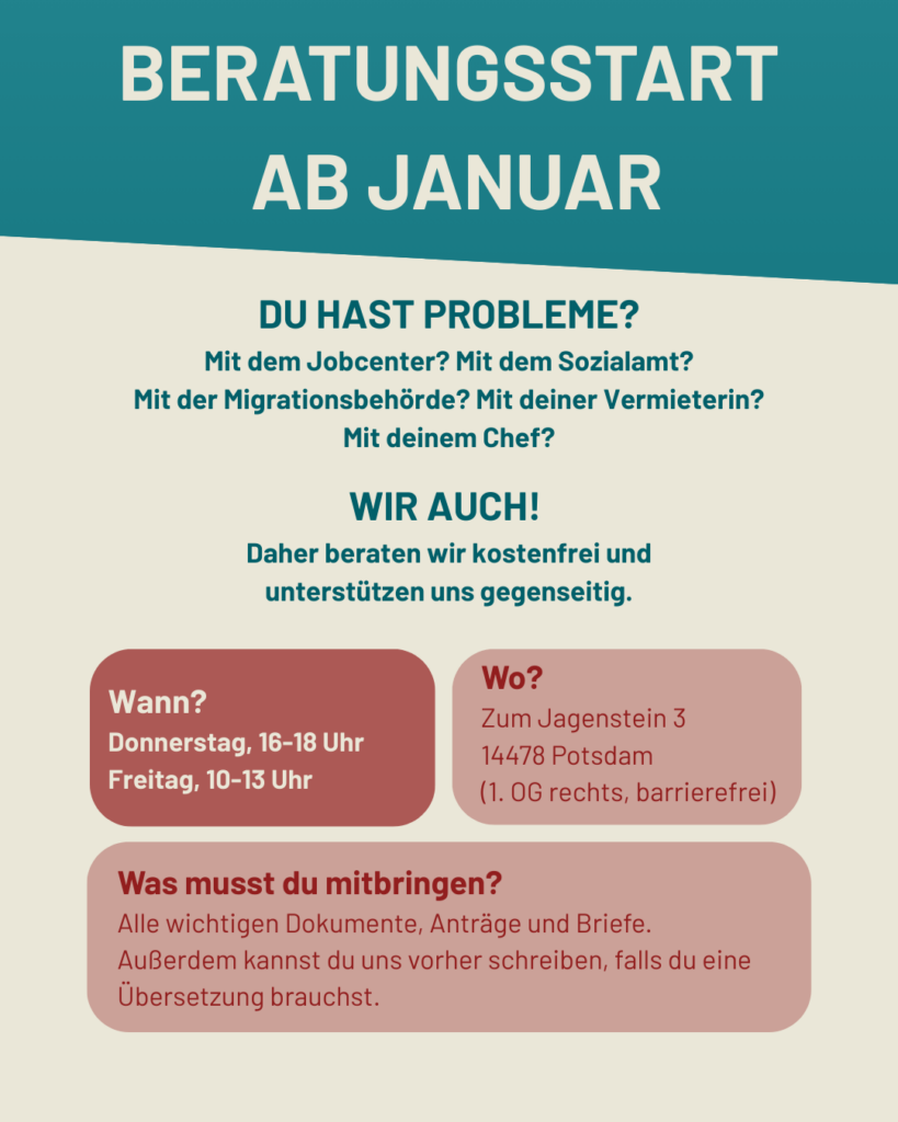 Außerdem wollen wir uns als Stadtteilgewerkschaft bei euch vorstellen. Wir setzen uns dafür ein, dass Menschen sich zusammenschließen, um sich gegen soziale Ungerechtigkeit zu wehren – sei es im Kampf gegen steigende Mieten, Probleme mit dem Jobcenter, der Ausländerbehörde oder prekäre Arbeitsbedingungen.