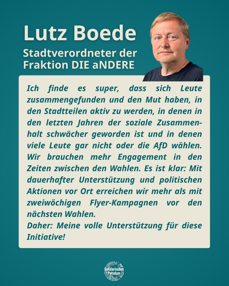 Unterstützer:innen In Potsdam gibt es tolle Menschen, die bereits seit vielen Jahren sehr aktiv für eine solidarische Stadtgesellschaft eintreten. Wir haben ein paar nach ihrer Meinung zu unserem Vorhaben gefragt und wir freuen uns über ihre Unterstützung! Potsdamer Stimmen Bild 6 von 9