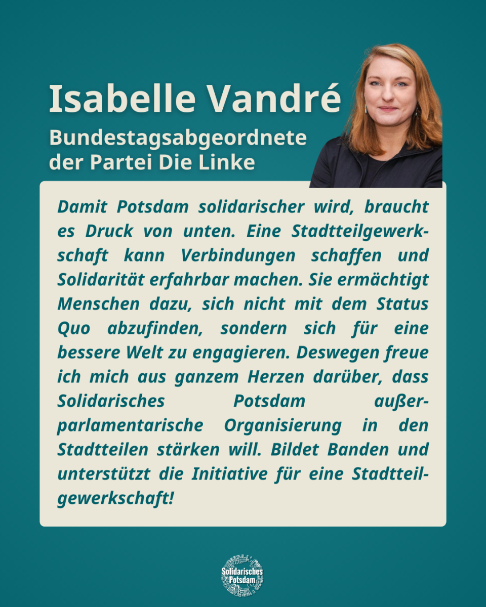 Unterstützer:innen In Potsdam gibt es tolle Menschen, die bereits seit vielen Jahren sehr aktiv für eine solidarische Stadtgesellschaft eintreten. Wir haben ein paar nach ihrer Meinung zu unserem Vorhaben gefragt und wir freuen uns über ihre Unterstützung! Potsdamer Stimmen Bild 4 von 9